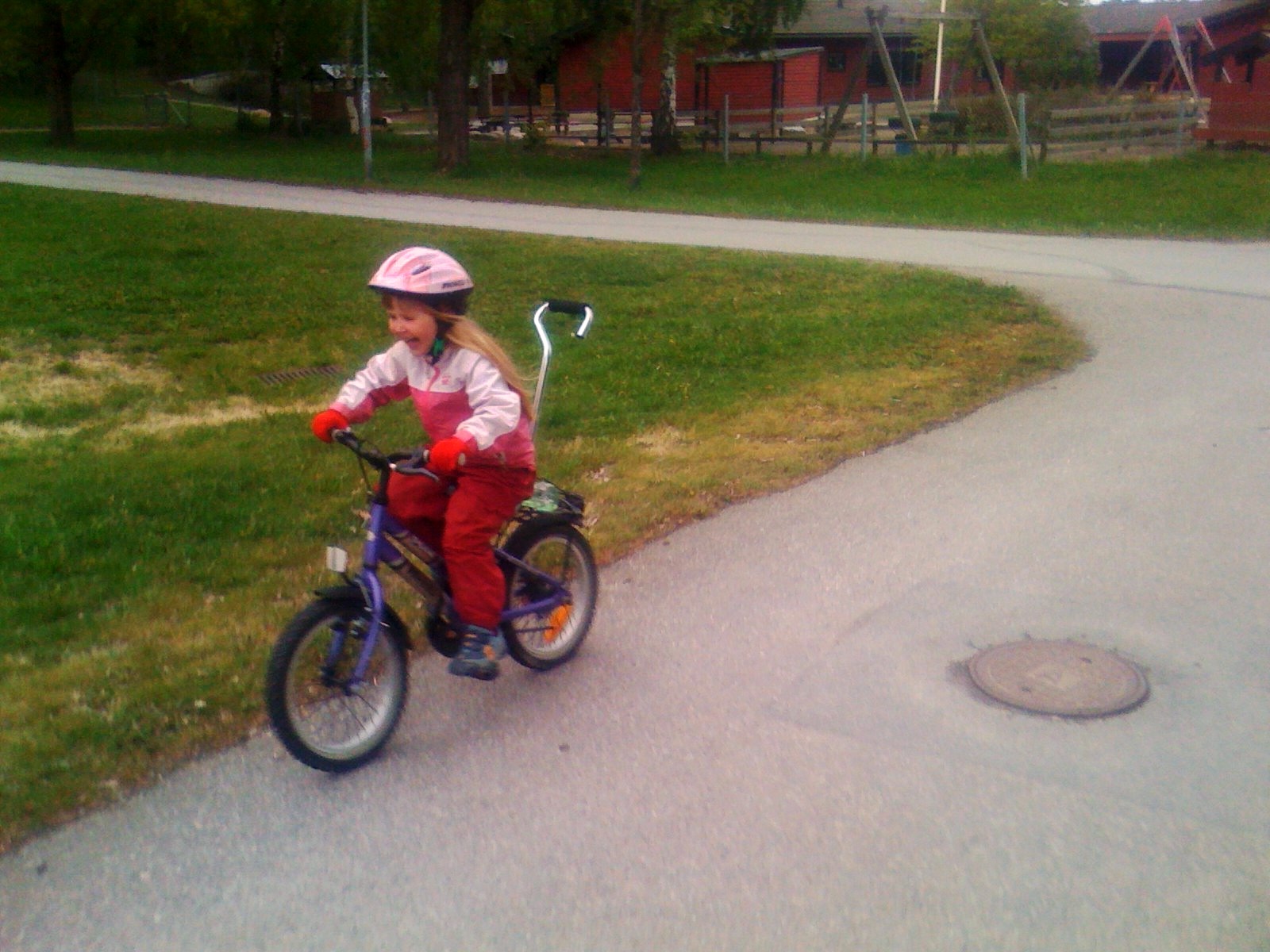 I dag tog vi en promenad till min far som skulle bjuda på mat nere på Viksjö Golfklubb. Nu hade någonting hänt med Ida. Hon trampar iväg i lugn takt och har inga som helst problem att hålla balansen i flera hundra meter. Jag behöver bara småjogga några steg ibland för att hålla jämna steg med henna och vara beredd på att hon ska stanna. För att bromsa har hon inte riktigt hajat ännu. Det är allt eller inget!