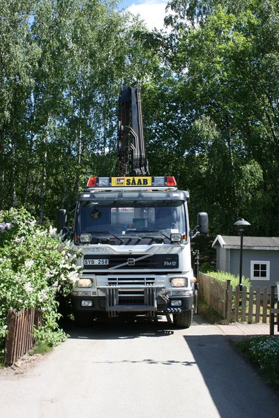 På lunchen ringde leverantören av allt material till renoveringen och sa att han snart skulle komma. Vad har Du för en bil frågade jag eftersom det är rejält trångt mellan husen. -En treaxlad Volvo med vanligt flak och kran. Svarade han. Jag talade om att han inte skulle komma ända in till huset och att vi skulle få lasta av vid garaget och bära in alltihopa.