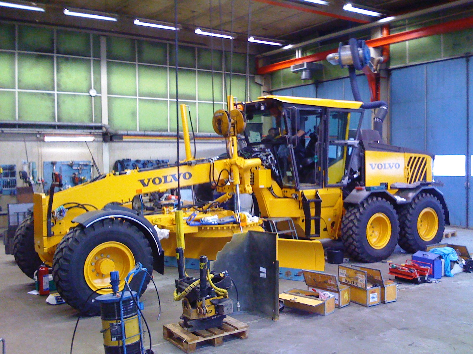 Jag är ute i verkligheten och lär mig nya delar av mitt jobb. Idag står jag därför i en verkstad i Örebro och lär mig att montera ett tvärfallssystem* på en väghyvel åt en kund i Burträsk, eller något annat jävla träsk i Norrland.