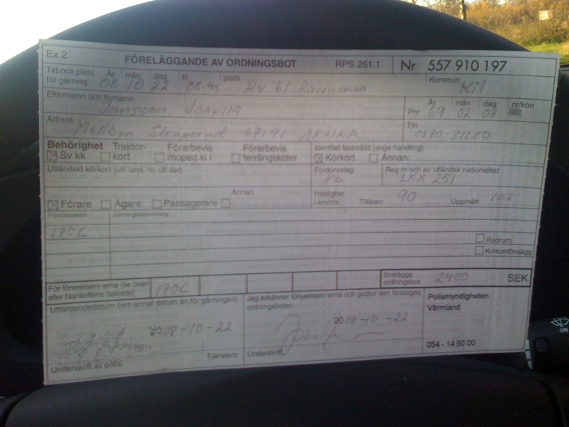 Så hände det då, jag åkte fast för fortkörning på väg till jobbet i morse. Faktiskt första gången sedan jag tog körkort och inget att bråka om. Men visst är det lite utstuderat att stå mitt på en 2-filssträcka på en 1+2-väg? Sen hade jag solen rakt i fejan och inte en chans attt se laser-snuten.