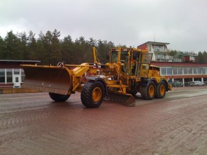 Verkar iaf. mycket roligare att meka med en väghyvel i pissväder än att se på trav i solsken. 🙂