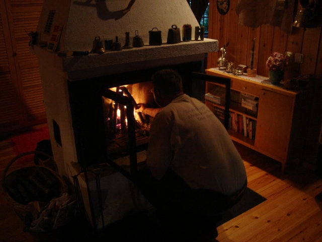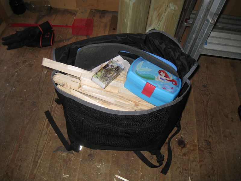 Jag fick henne att lugna sig en stund till men kl. 10 stod vi och packade ved i en väska som redan var överfull med fikaprylar.