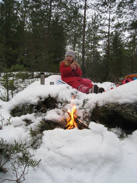 Det här med brasa är en liten pedagogisk grej för Johanna. Av någon anledning är hon vansinnigt rädd för öppen eld som inte brinner i en öppen spis eller kamin. Jag försöker därför att elda litegrann så ofta jag får tillfälle för att visa henne att det inte är farligt. Idag var det ju snö runt och jag visade hur elden slocknar så fort man lägger lite snö på den. Det var hon imponerad och nöjd av så idag gick det helt lungt och smärtfritt när jag plockade fram den lilla pyromanen inom mig.