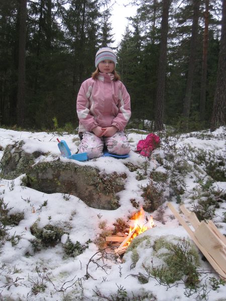 När Johanna kom hem med skolbussen var det första hon frågade mig när hon kom in: -När ska vi gå till skogen då? Så det var bara att göra om proceduren. Väska med fika och ved och så ut i skogen. Men nu tog vi vår skog som ligger alldeles runt huset, smidigt som attan!
