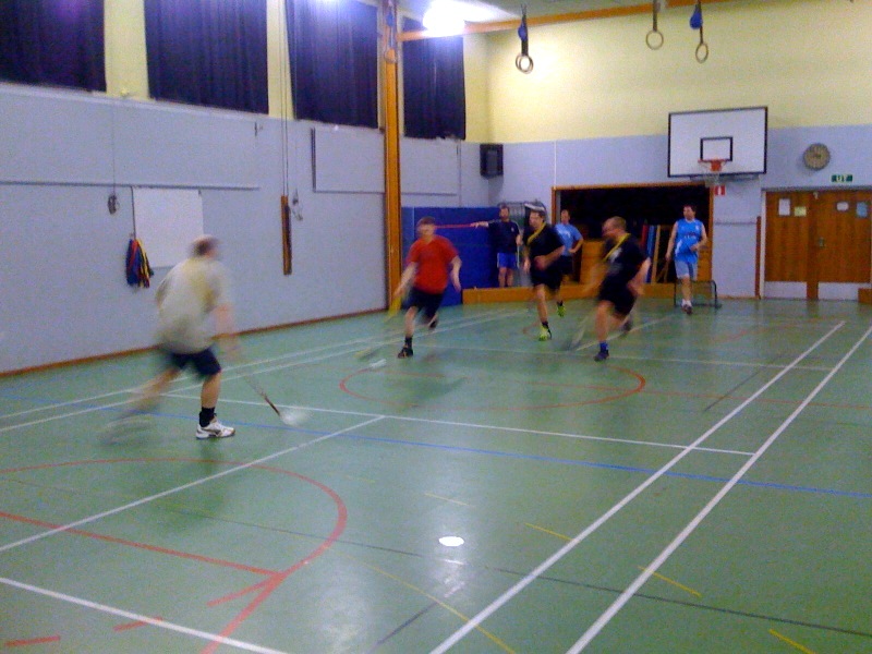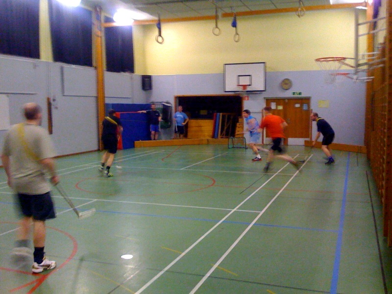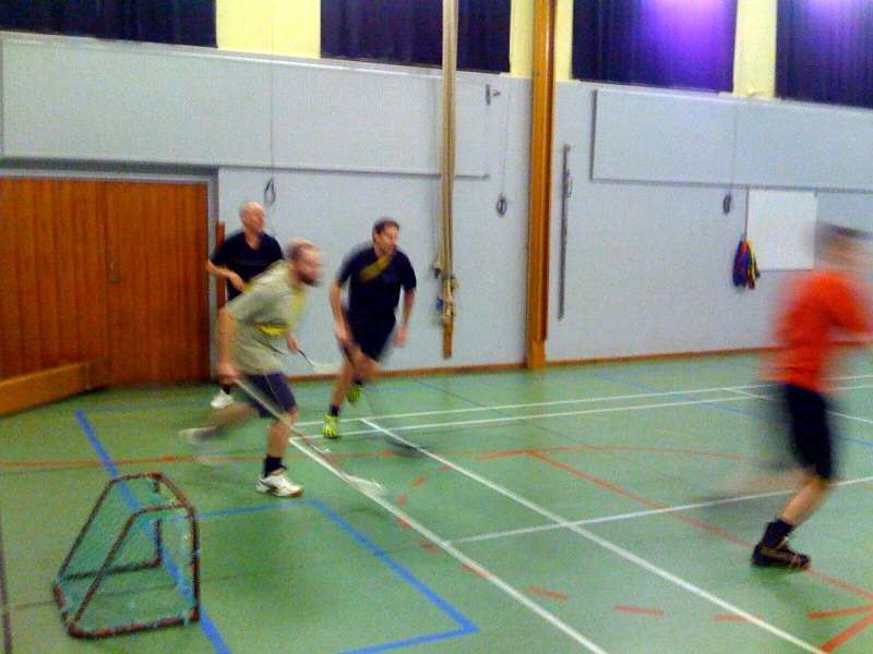 Efter en kort uppvärmning så slängdes alla klubbor i en hög för att delas upp till två lag. Matcherna gick till 3 och det var bäst av 5 vinster som gällde. Jag lyckades näta först av alla efter bara någon minut. Vårt lag vann första uppgörelsen och det var ungefär så länge som jag kände mig något sånär pigg. Sen sinade signalsubstansen mellan hjärnan och musklerna. Skallen signalerade ”snabbvändning” och musklerna skrek tillbaka ”glöm det pucko!”
