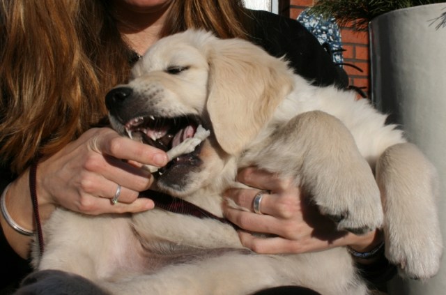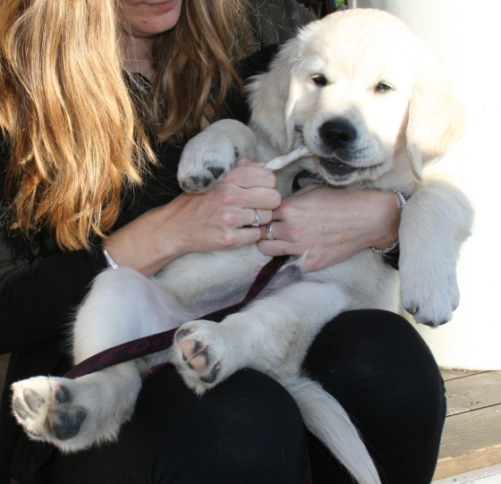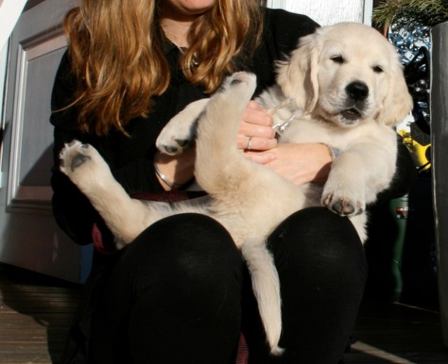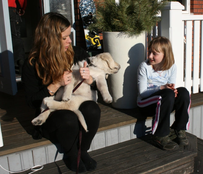 Problem är till för att lösas så också J’s hundrädsla. Vi har sagt till J att vi måste träffa hundar så att hon vänjer sig och när vi åkte upp till Lofsdalen över påsk så passade vi på att titta in hos min gudson i Torsby. Där finns sedan några veckor en 11-12 veckor gammal Golden retriever-valp som heter Azlan. Alltså han är så gullig att det inte går att låta bli honom. J var rädd som vanligt och vägrade att gå in i huset om inte valpen var instängd i ett annat rum. Vi gosade med Azlan medans J satt rädd och ängslig på en stol i köket. Men strax innan vi skulle gå så förmådde hon sig att klappa valpen på rumpan om vi höll i huvudet på honom. Ett litet framsteg för J!