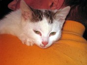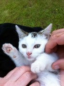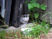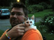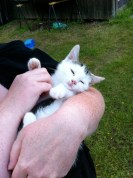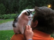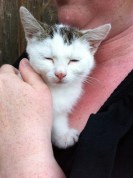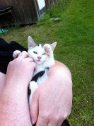 Det var ju för drygt en vecka sedan som den lilla kattungen satt och jamade utanför vårt hus. Efter att den fått lite mat och mänsklig kontakt så bestämde den sig för att bosätta sig under ett av uthusen. Jag fick tag på katten en kväll och vi kunde plocka bort ett part fästingar på den medans den spann förnöjt på min axel.
