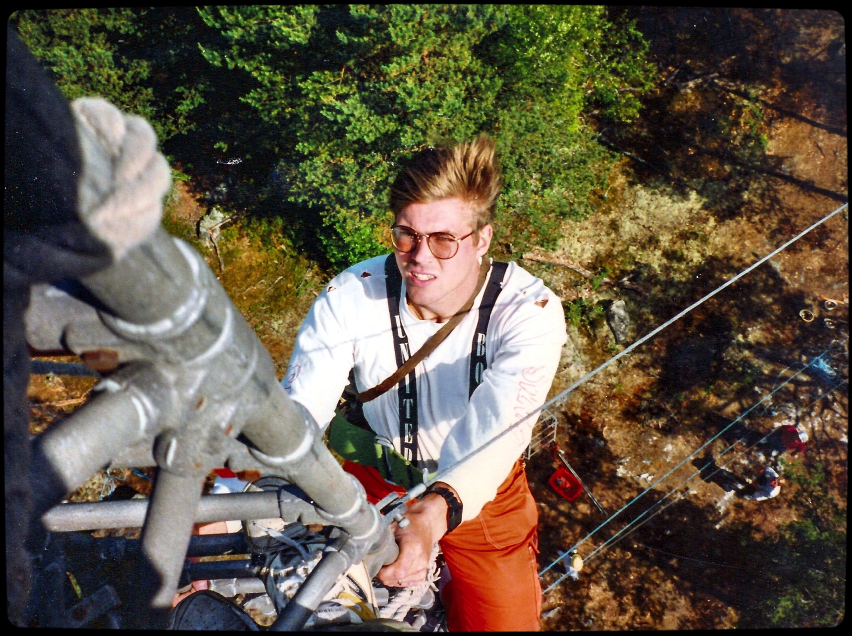 Under fältövningarna i Rånäs 1992 var vi ett modigt gäng som byggde fackverkstorn på dagarna och mätte stomnät på nätterna då det var svalt och sommarvärmen inte skapade luftdaller som försvårade sikten i mätinstrumenten. Tornen var 23 meter höga med en liten plattform på 21,5 meters höjd. Sista fackverksdelen var så smal att man bara kunde sätta en fot i taget i trappsteget när man klättrade upp.
